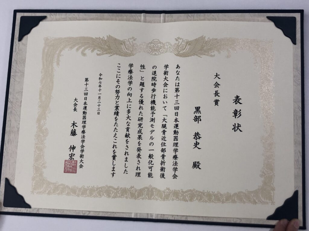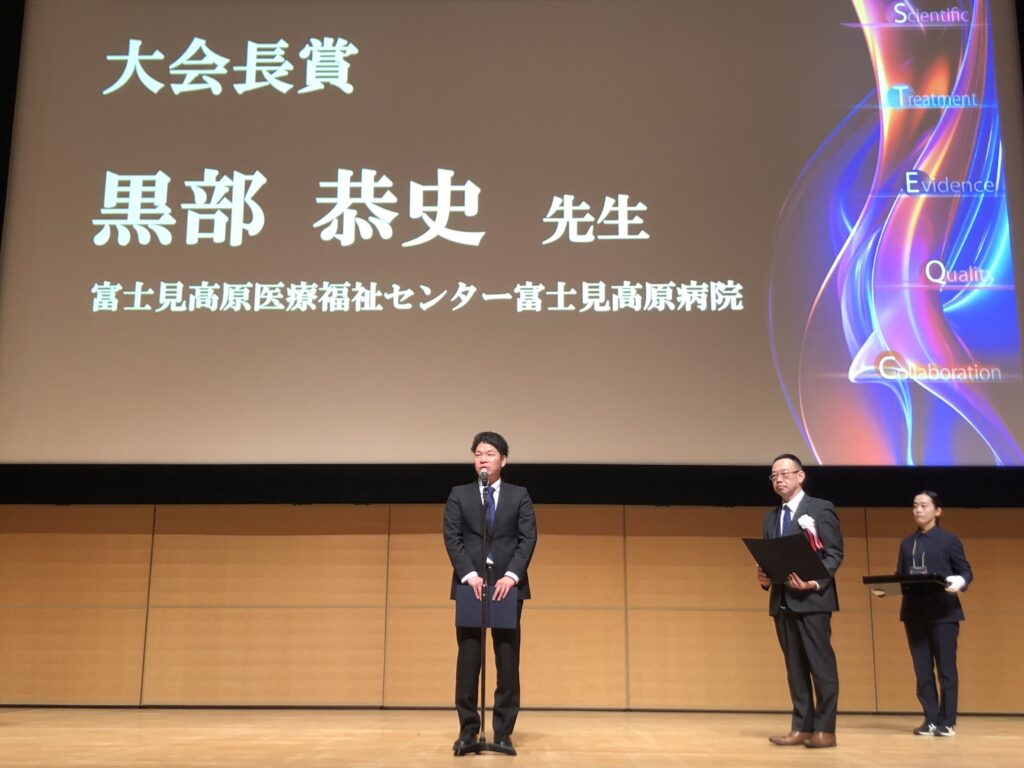 令和7年11月22日~23日に大阪国際会議場で行われた第13回日本運動器理学療法学会学術大会において、学術研究院保健学系特任助教の黒部恭史さん(富士見高原医療福祉センター富士見高原病院)が大会長賞を受賞しました。