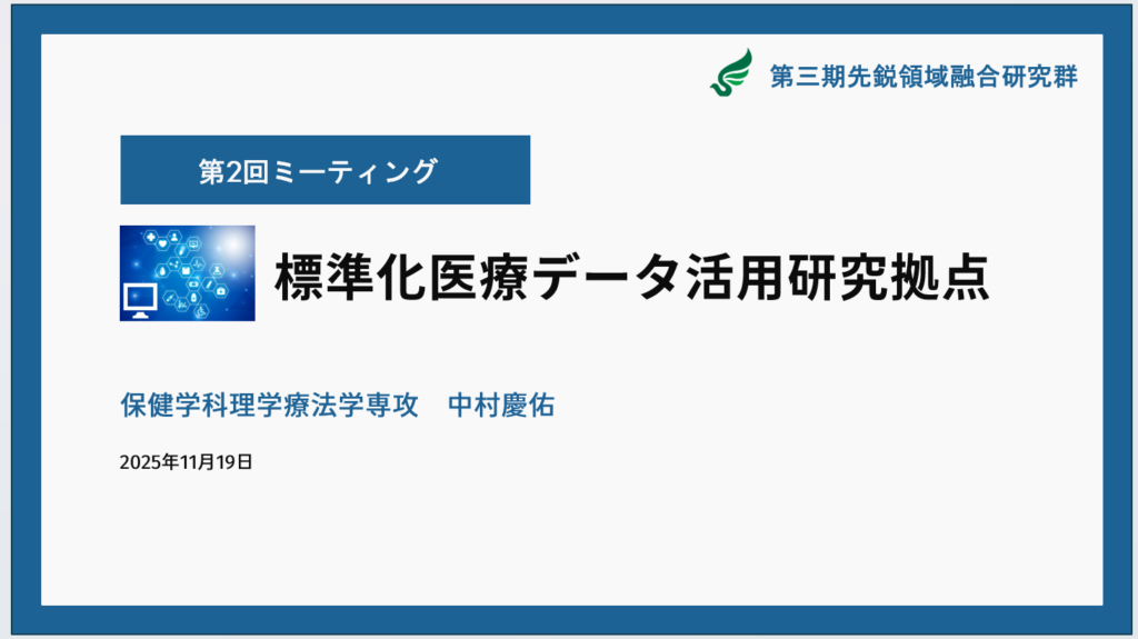 本ミーティングでは、医療データ活用システムの開発状況および、開発システムを活用した各プロジェクトの進捗について共有を行いました。